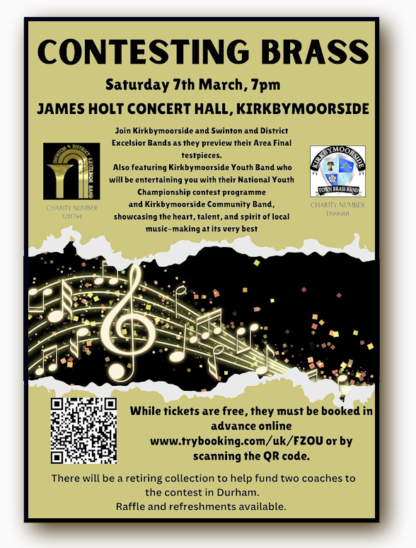 ![]() Contesting Brass Saturday 7th March 2026 James Holt Concert Hall Join Kirkbymoorside Band and Swinton and District Excelsior Bands as they preview their Area Final test pieces. Also featuring Kirkbymoorside Youth Band who will be entertaining you with their National Youth Championship contest programme and The Kirkbymoorside Community Band, showcasing the heart, talent, and spirit of local music-making at its very best. While tickets are free, they must be booked in advance online, just click this link www.trybooking.com/uk/FZOU or scan this QR code with your mobile camera. ![]() |